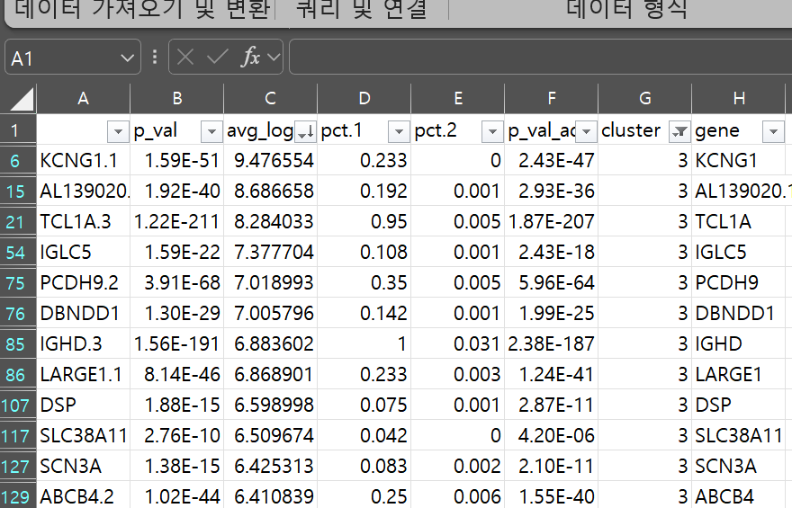 그러면 이제 "Cluste_marker.csv"라는 파일이 만들어졌을 것입니다. 여기에서 cluster annotation을 하기 위해서 필터를 지정하고, avg_log2FC를 내림차순으로 정리한 후 cluster 3에서 높게 발현하는 유전자를 찾아봅시다.