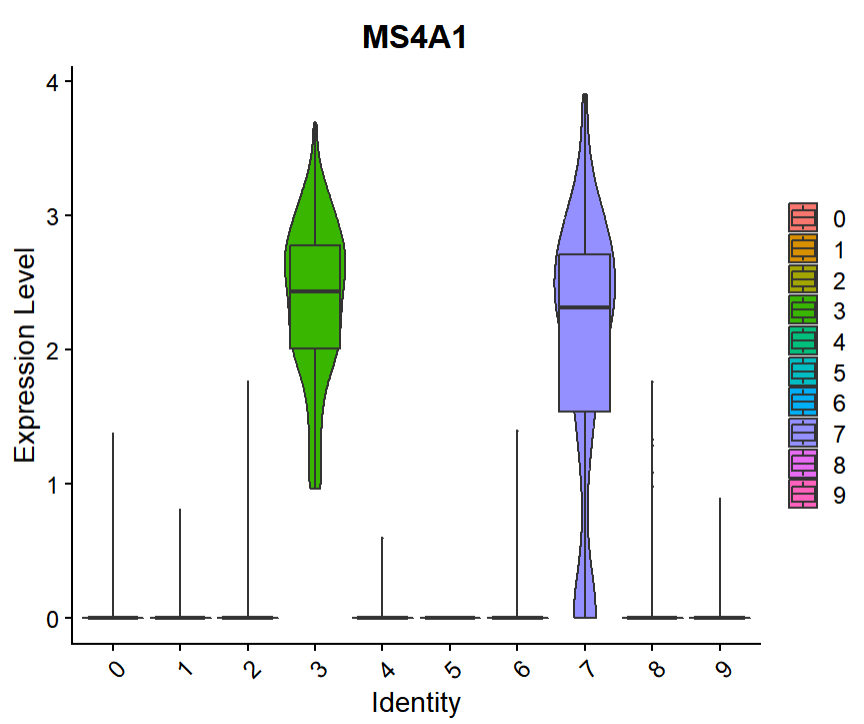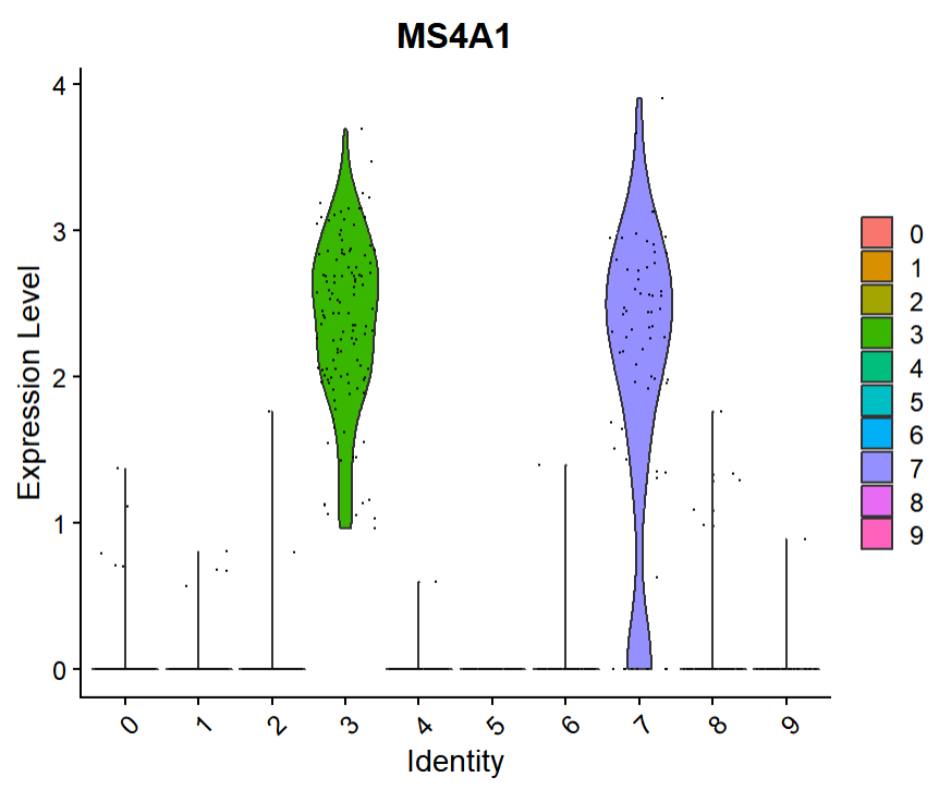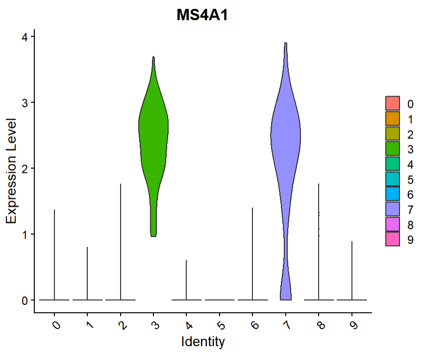 violin plot을 그리기 위해 사용하는 함수는 VlnPlot( )이며, 전에 Featureplot에서 살펴봤던 유전자 'MS4A1'에 대한 violin plot을 그려보겠습니다.