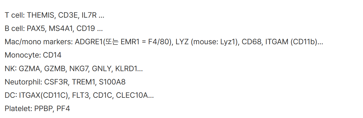 참고로 PBMC를 대상으로 하니 (거의) 모든 세포가 면역세포일 것이고, 이는 T세포, B세포, 마크로파지, 호산구, DC, Platelet 등으로 나뉠 것이라고 하는데, 그만큼 각 celltype의 표준이되는 마커를 먼저 살펴보면 클러스터 특성을 추론하기 용이하다고 합니다.