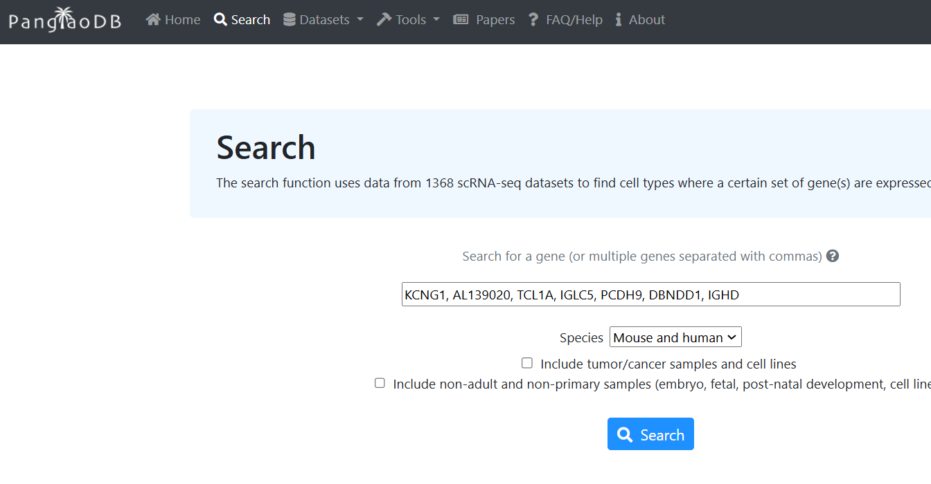 PanglaoDB is a database for the scientific community interested in exploration of single cell RNA sequencing experiments from mouse and human. We collect and integrate data from multiple studies and present them through a unified framework. Adapted from th