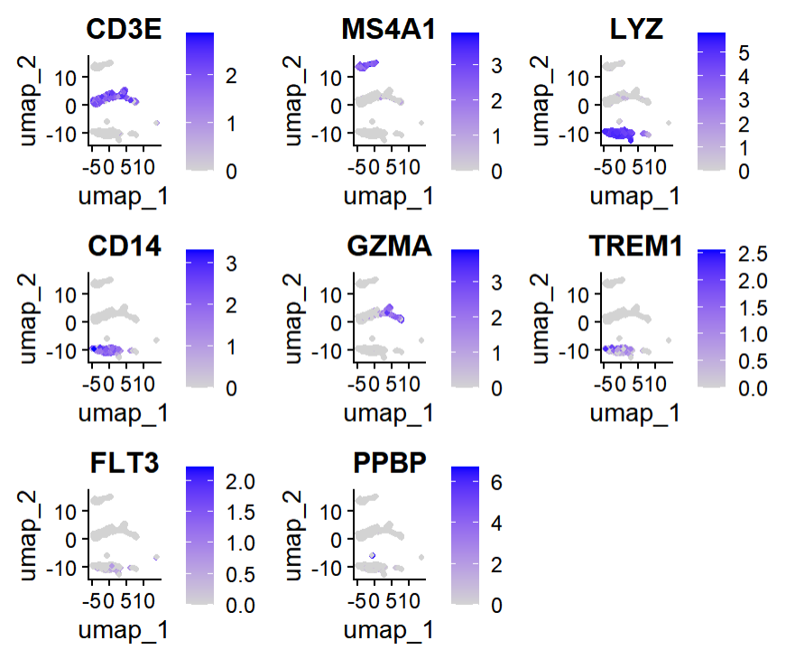 FeaturePlot(pbmc_tutorial1, c("CD3E", "MS4A1","LYZ", "EMR1", "CD14", "GZMA", "TREM1", "FLT3", "PPBP"))