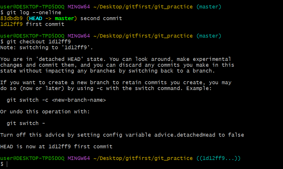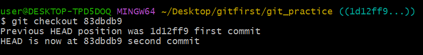 여기서 second commit의 식별자인 83dbdb9와 $ git checkout을 사용해서 "오늘은 날씨가 춥다"가 입력된 시점으로 돌아가보겠습니다.