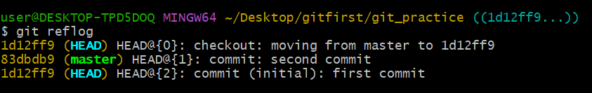 이럴 때는 돌아갈 수 있는 마커를 확인하기 위해 HEAD가 이동해온 이력을 알려주는 명령어인 $ git reflog를 입력해줍니다.