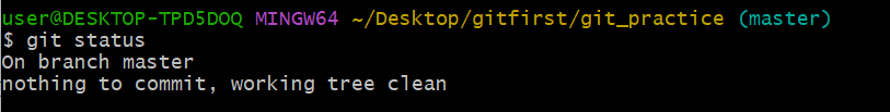 제가 입력한 이름 'TKM'이 first commit이라는 수정이력을 12월 21일 오후 1시에 만들었다고 나오네요. 추가적으로, $ git status로 staging area에 있는 파일이 있는지 확인해봅시다.