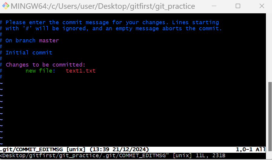 다음으로 $ git commit 명령어를 사용해 Staing Area에 대기중인 'text1.txt' 파일을 Respository에 추가해보겠습니다.