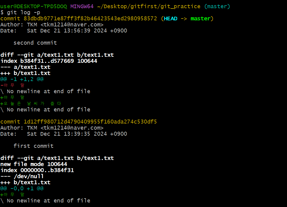 먼저 어떤 변경사항들이 생겼는지 자세하기 볼 수 있는 $ git log -p를 입력해봅시다.