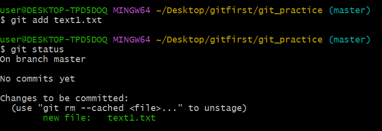 "Untracked files"에서 "Changes to be commited"로 바뀌면서 글자 색깔도 빨간색에서 녹색으로 바뀐 걸 확인할 수 있는데요, 그러면 이제 파일 수정사항이 Staging Area로 들어간 겁니다.