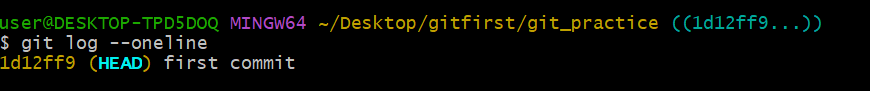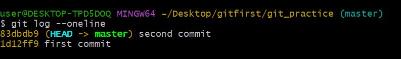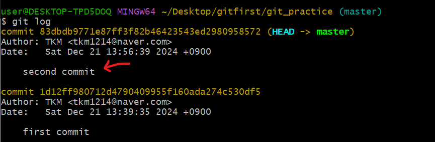 저는 두 개 밖에서 커밋한 이력이 없어서 이렇게 간단하게 나왔는데요, 커밋이 여러 개가 있을 때 특정 개수만 보고 싶으면 $ git log -(숫자)를 입력하면 됩니다. 예로, 한개만 보고 싶으면 $ git log -1을 쓰면됩니다.