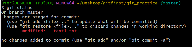 파일을 수정하고 저장소에 보내지 않았으니, $ git status를 입력하면 "저장소로 보내야 할 즉, 커밋해야 할 수정한 기록이 있는 파일이 있다"라는 식의 말이 나올겁니다.