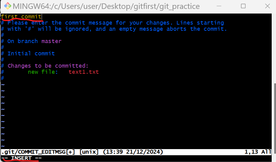 여기서 'Shift'를 누르고 i를 누르면 아래 "-- INSERT"라고 바뀌면서 본 화면에 저장할 commit의 이름을 입력할 수 있게 됩니다. 저는 아래와 같이 "first commit"이라고 입력해보겠습니다.