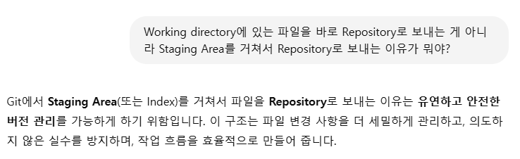 여기서 Working Directory에 있는 파일을 바로 저장소(Repository)에 보내지 왜 Staging Area를 거치는지 의문이 생기지 않나요? 그 이유를 챗GPT에게 물어봤습니다.