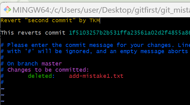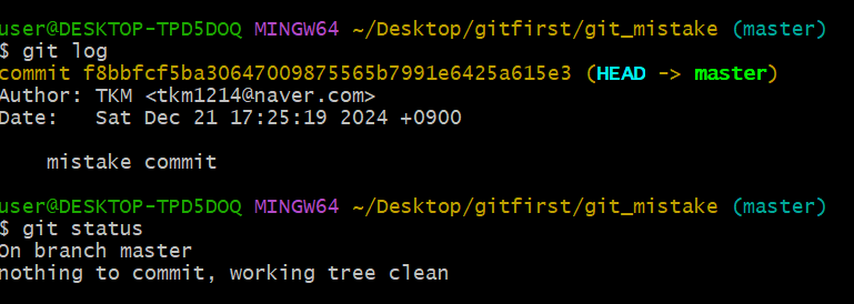 그럼 직접 해봅시다. 우선, 아까 mistake1. txt 수정사항이 working directory에 있는 상황에서 이 수정사항을 "mistake commit"이라는 이름으로 먼저 repository로 보내겠습니다.