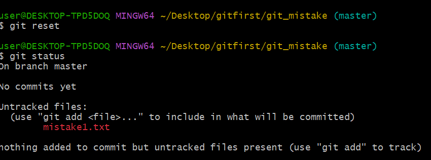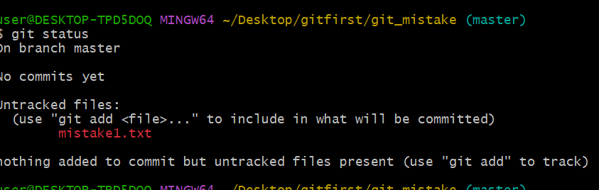 그럼 $ git status를 입력했을 때 mistake1.txt가 수정을 기록해야 할 파일로 뜰겁니다.