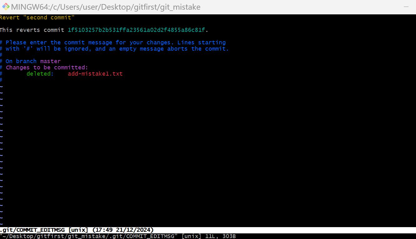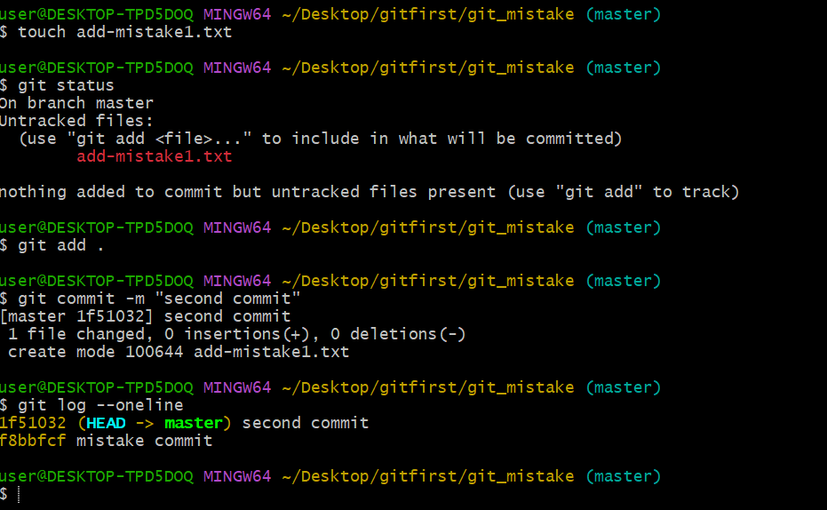 이를 위해 강의에서 처럼 새롭게 add-mistake1.txt를 만들어주고 수정사항을 "second commit"이라는 이름으로 repository에 저장해봅시다.
