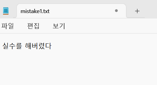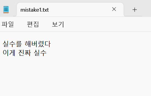 다음으로 다시 mistake1.txt를 열고 한 줄을 더 추가해줍시다. 이 추가된 줄이 "실수의 줄"입니다.