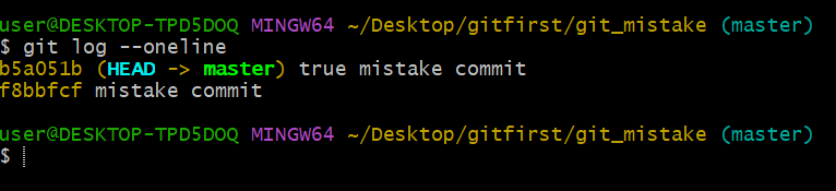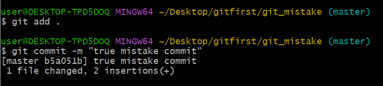 그럼 다시 status로 보면 untracked files로 mistake1.txt가 뜰 것이고, 요걸 실수로 staging area를 넘어 repository까지 "true mistake commit"으로 보내버렸다고 해봅시다. 다음과 같이 말이죠.