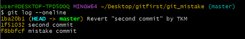 이 second commit이 바로 실수였습니다. 그럼 실수를 바로잡기 위해, 그러면서도 바로잡은 기록을 남기기 위해 $ revert를 사용해보려고 합니다. 이때 revert 뒤에는 돌아가고자 하는 commit이 아니라 실수한 커밋 즉, 되돌릴 커밋의 커밋해시를 입력해줍니다. 이 경우엔 1f51032가 되겠죠.