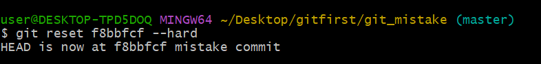 저는 reset 그 중에서도 repository, staging area, working directory 모두 mistake commit으로 돌아가는 --hard 옵션을 사용해보겠습니다. 만약 soft였다면 staging area와 working directory는 현 상태 유지였을 겁니다.