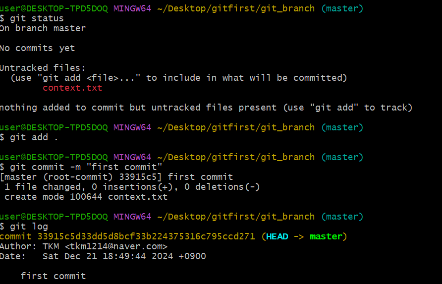 다시 $ git branch를 입력해보면, master 브랜치가 만들어졌다는 것을 알 수 있습니다.