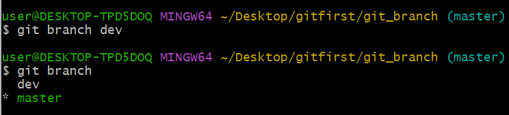 그럼 master에 new branch인 'dev'라는 이름의 브랜치를 추가해보겠습니다. 다음과 같이 branch 뒤에 지정하고 싶은 브랜치명(ex. dev)을 입력하면 됩니다.