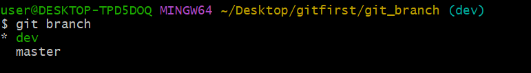 저의 경우에는 $ git checkout dev를 입력하니 (master)에서 (dev)로 바뀌었음을 확인할 수 있습니다. $ git branch를 입력해서 *의 위치를 보고도 현재 위치를 확인할 수도 있습니다.
