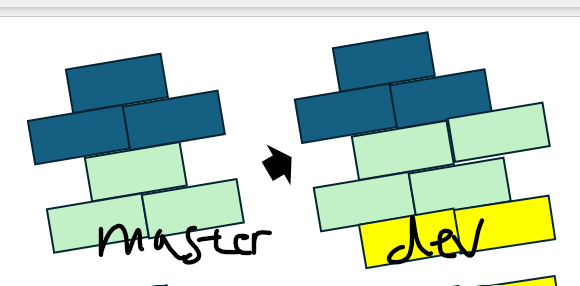 dev 상위에 있는 master 입장에서는 dev가 관계 없는 것이기에, dev에서 만든 "my commit on dev"는 보이지 않게 됩니다. 요런 식으로 오른쪽에서 왼쪽으로 가면 노란 색이 없어지는 것처럼 말이죠.
