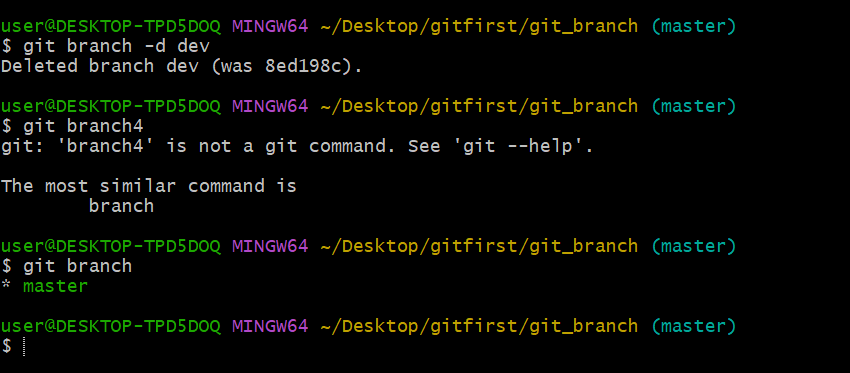 이렇게 $ git branch를 입력했을 때 dev가 사라지고 master만 나타남을 확인할 수 있습니다.
