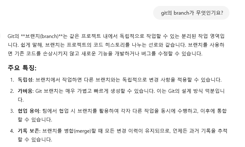 우선 git의 branch가 무엇인지부터 알아보죠. 역시 챗GPT에게 물어봤습니다.