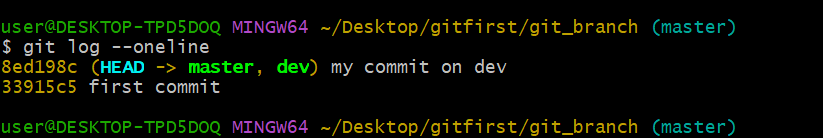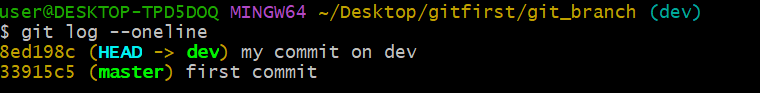 자세히 보면 "my commit on dev"는 dev에 저장되어 있고, "first commit"은 master에 저장되어 있는 것을 확인할 수 있습니다. oneline으로 간단하게 봅시다.
