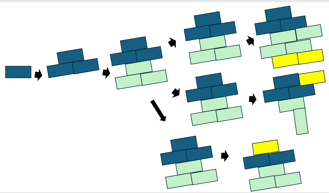 브랜치가 이어지는 과정의 예로, 각각의 브랜치에 레고블록으로 만든 건축물의 정보를 기억해두고, 그 기억을 토대로 과거 이전의 정보로 돌아가거나 새로운 레고 블록을 더하는 작업을 브랜치 간의 연결과 이동으로 여러 명이 동시에 혹은 한 사람이 여러 번 진행할 수 있게 됩니다. 아래처럼 말이죠.