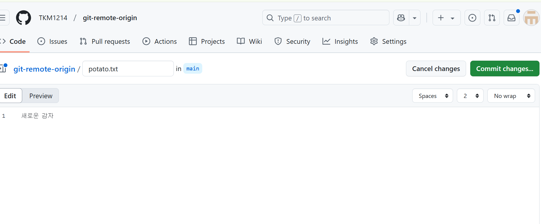 여기에다가 'Name your file'에 'potato.txt'를 만들고 그 안에 아무 내용이나 입력해봅시다. 그리고 오른쪽에 있는 Commit changes를 누릅니다.
