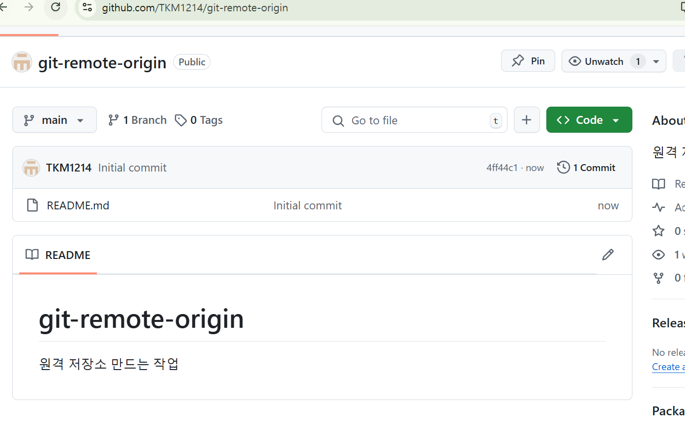 이렇게 하고 create 버튼을 누르면, README에 "원격 저장소 만드는 작업"이라는 문장이 등장하게 됩니다.