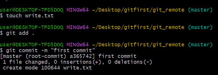 위의 이미지를 자세히 보면 write.txt의 커밋 메시지인 "first commit"이 입력되어 있음을 알 수 있습니다.