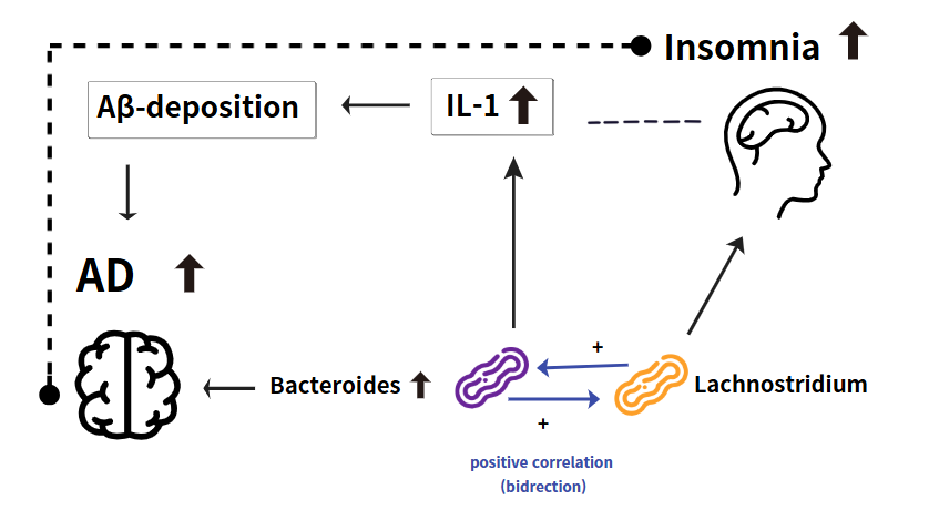 그때 선행 연구를 찾아보니까 insomnia와 AD가 연관이 있다고 알려져 있었고, 장내미생물이 장뇌연결축(MGBA)을 통해 이 insomina와 AD 질환에 영향을 주고, 장내미생물의 상호작용이 장뇌연결축을 망가뜨릴 수 있다고 알려져 있었던 만큼 두 질환과 관련된 장내 미생물 사이의 상호작용이 이 두 질환 발병에 시너제틱하게 영향을 줄 수 있지 않을까 하는 생각에 분석을 진행해보았습니다.