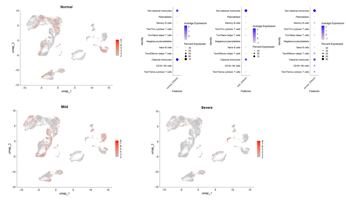 본 연구팀은 앞서 scRNA-seq 데이터로부터 annotation한 세포 유형을 주요 세포 유형 6개(CD4+ T cells, CD8+ T cells, NK, monocytes, DC, B cells)로 그룹지어서 각 세포유형별 세 가지 조건(self-reported, hospitalized, very severe)의 COVID-19 GWAS phaneotypes과의 연관성을 scRDS를 활용해 평가했습니다. 그 결과, self-reported infection GWAS에 대해 유의하게 enrich되는 cell type은 나타나지 않은 반면, monocyte는 very severe GWAS, DC는 hospitalization과 very severe GWAS와 연관되어 있다고 나타났습니다. 이를 통해 COVID-19의 severity에 관여하는 polygenic risk가 선천 면역을 책임지는 monocyte, DC와 같은 세포 유형에서 enrich하게 나타남을 입증할 수 있었습니다.