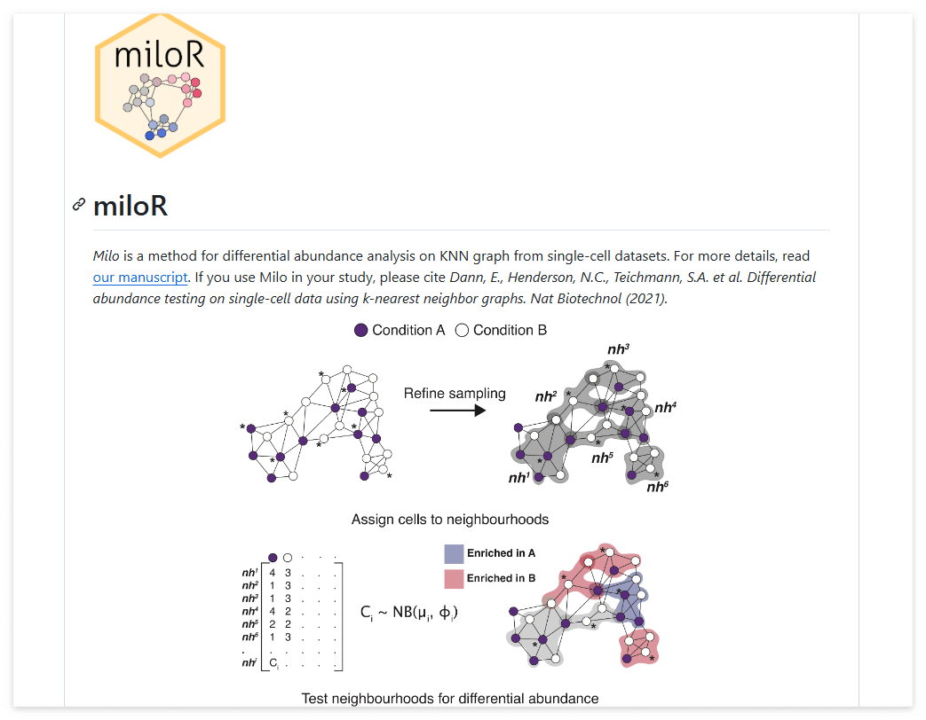 여기서 Milo는 k-nearest neighbor graph를 통해 differential abundance가 유사한 세포를 모아 겹치는 소그룹인 'neighborhood'로 지정하는데요. 전통적인 방식과 달리 그룹 간에 세포가 서로 겹치기에 세포 상태가 연속적으로 변화하는 경우에도 미세한 국소적 변화를 잘 반영할 수 있다고 합니다. 참고로, KNN 그래프를 기반으로 하는 만큼 위의 그림에서처럼 index cell을 중심으로 선정하고 index cell과 가까운 세포를 모아 neighborhood를 만들고, 음이항 GLM을 이용해 조건 간 유의한 세포 수 차이를 보이는 neighborhood를 찾는다고 합니다.