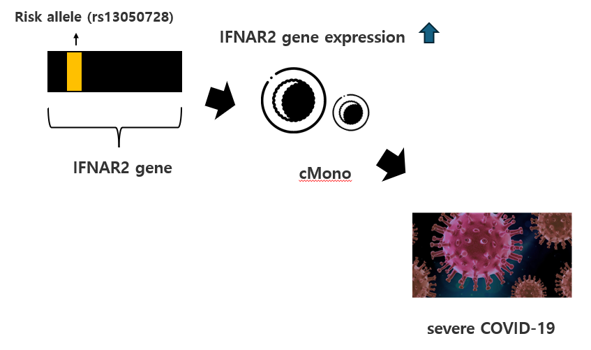 IFNAR2은 Type I IFN signaling pathway에 핵심 역할을 하기에, 본 연구팀은 보다 세부적으로 IFNAR2 variant의 eQTL effect를 조사했습니다. 그 결과 Monocytes에서 IFNAR2 expression와 연관된 risk allele의 높은 effect size 즉, COVID-19 context-specific increasing dosage effect가 나타났습니다. Monocyte 중에선 cMono에서 특이적으로 높은 effect size를 보였습니다. 종합적으로 본 연구결과는 rs13050728의 risk allele가 cMono에서 IFNAR2의 발현 증가를 통해 severe COVID-19에 기여할 수 있음을 시사합니다. 그만큼 COVID-19의 pathophysiology에 대한 host genetical effects를 규명하는 데 있어 context & cell type-specific eQTL effect를 고려하는 게 중요하다고 볼 수 있겠습니다.