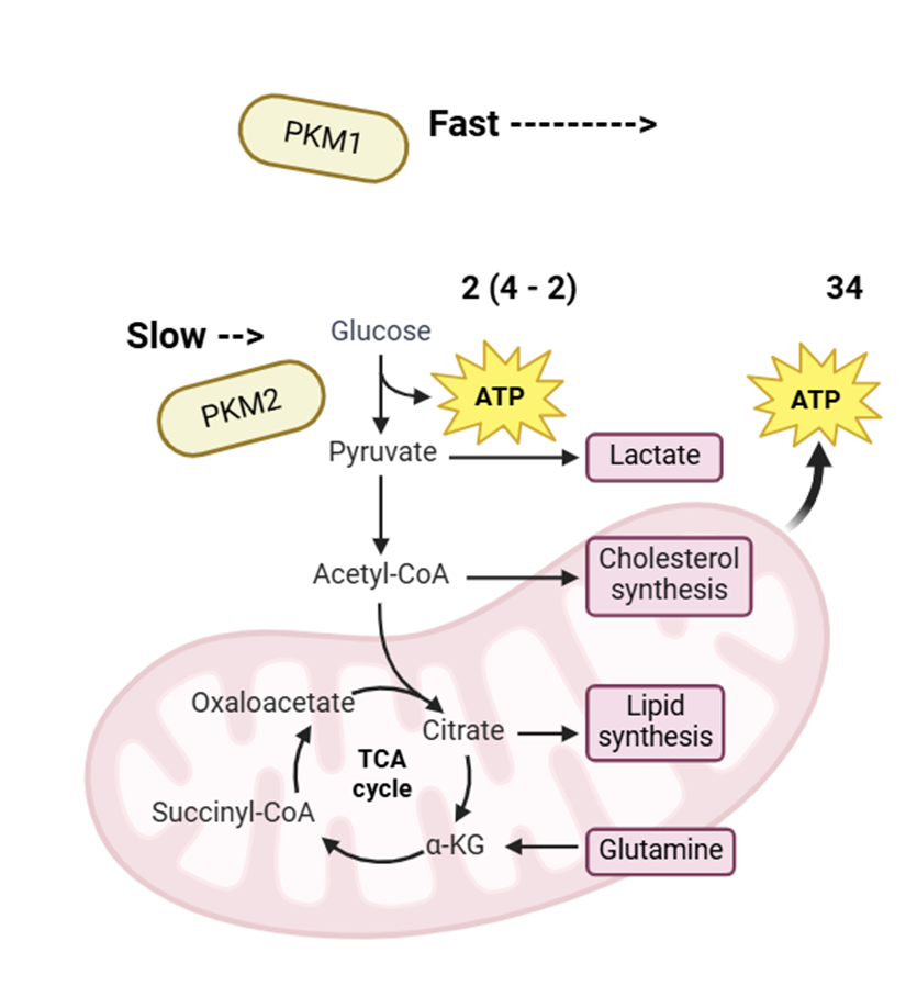 PKM2는 피루브산 키나아제의 일종으로, 포스포엔올피루브산(PEP)과 ADP를 피루브산과 ATP로 전환하는 반응을 촉매하는 효소입니다. 이 과정은 해당과정에서 포도당을 피루브산으로 전환하는 일련의 단계 중 마지막 단계에 해당합니다. 그렇게 만들어진 피루브산은 이후 미토콘드리아로 이동하여 산화적 인산화를 통해 더 많은 ATP를 생산하는 데 사용되는데요. 물론 해당과정에서도 포도당 1개 당 ATP 2개가 생성되지만, 이는 2개를 소비하여 4개를 만들어내는 반응에 불과하며, 해당과정을 통해 만들어진 피루브산으로부터 진행되는 '산화적 인산화'로 생산되는 약 34개의 ATP에 비하면 훨씬 적은 양입니다. 또 다른 피루브산 키나제인 PKM1은 고촉매 활성을 나타내어 피루브산을 신속하게 미토콘드리아로 전달함으로써 산화적 인산화가 원활하게 이루어지도록 합니다.