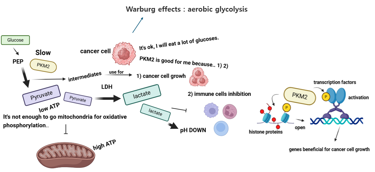 PKM2의 이러한 특성은 암세포에게 매우 유리하게 작용합니다. 먼저 암세포는 산소가 충분해도 산화적 인산화를 거치지 않고, ‘유산소 해당작용(aerobic glycolysis)’만으로 ATP를 생성하는 이른바 Warburg 효과를 보입니다. 이는 암세포가 포도당을 과도하게 섭취해(주변 정상 세포의 포도당 섭취를 방해할 정도로) 해당과정에서 생산되는 상대적으로 적은 양의 ATP만으로도 충분한 에너지를 확보할 수 있을 뿐 아니라, 해당과정 중간 산물(intermediate)이 암세포의 빠른 성장·증식에 도움을 주기 때문으로 추측되고 있습니다. 이러한 맥락에서 해당과정의 속도를 조절해 에너지 대사를 해당과정에 의존하게 만드는, 그러면서 암세포 성장과 증식에 도움이 되는 중간체를 많이 만들어내도록 하는 PKM2는 암세포가 빠른 성장을 위해 필요한 물질을 지속적으로 공급받는 데 도움을 줍니다. 특히 피루브산이 젖산으로 전환되어 형성되는 산성 환경은 면역세포의 접근과 기능을 저해해 암세포 살해를 어렵게 만든다고 합니다. 심지어 PKM2는 혈관신생 유전자(빠르게 증식하는 암세포가 밥먹으려면 혈관도 빠르게 신생하며 영양분 보충해야 하기에), 지질 합성 유전자(빠르게 증식하는 만큼 세포막도 많이 필요하기에) 등 암세포 생존·증식에 관여하는 유전자 발현을 조절하는 전사인자나 히스톤 단백질의 활성을 조절하여 암세포에게 유리한 환경을 조성한다고 알려져 있습니다. 이를 Biorender에서 그림으로 나타내봤습니다. 유료 결제를 하긴 했는데, 되게 알찬 웹 툴인 것 같습니다.