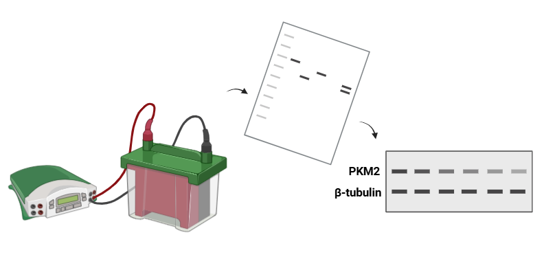 참고로 western blot은 세포에서 전체 단백질을 동정한 뒤, SDS-PAGES라는 전기영동을 통해 단백질의 아미노산 서열에 따른 '전하'와 서열의 길이에 따른 '크기'에 따라 단백질들을 분리한 뒤, anti-PKM2라는 PKM2 단백질에 붙는 항체, 그리고 그에 대한 2차 항체(신호 증폭이 가능한 민감도 높은 간접 기법)를 통해 PKM2의 위치를 파악한 뒤, 그 단백질 밴드의 수준을 광학 기법을 통해 확인하는 기법입니다. western blot에서 사용되는 β-tubulin은 흔히 하우스키핑 단백질(housekeeping protein)로 사용되는데요. 이 단백질들은 세포에서 상대적으로 안정적이고 균일하게 발현되기에 각 셀라인을 동일한 양의 단백질로 로딩했는지 확인하고, PKM2라는 목표 단백질의 상대적 발현량을 비교할 수 있게 한다고 합니다.