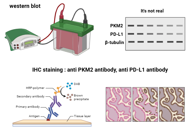 이후엔 PKM2가 HCC의 악성 포텐셜을 조절하는 메커니즘을 조사하기 위해, GSEA를 통해 TCGA 데이터의 PKM2 high expression group에서 어떤 생물학적 과정과 관련된 유전자 세트가 높게 나타나는지 확인하였으며, in vivo 조건에서의 PKM2의 발현 정도에 따른 lactate production 정도도 Lactate detection assay를 통해 확인하였습니다. 이 PKM2가 암세포에서 어떤 역할을 하는지 궁금하지 않을 수 없으니까요. 또한, HCC 미세환경 내 면역반응에서의 PKM2의 역할을 조사하기 위해, GSEA를 사용해 PKM2-high group에서 풍부하게 나타나는 면역 반응 관련 signature 유전자 세트도 확인했습니다. 이후 GEPIA를 활용해 PKM2와 PD-L1 사이의 상관관계를 분석하였고, western blot과 IHC 염색을 통해 in vitro protein level에서도 그 둘이 상관성이 나타나는지 확인하였습니다.
