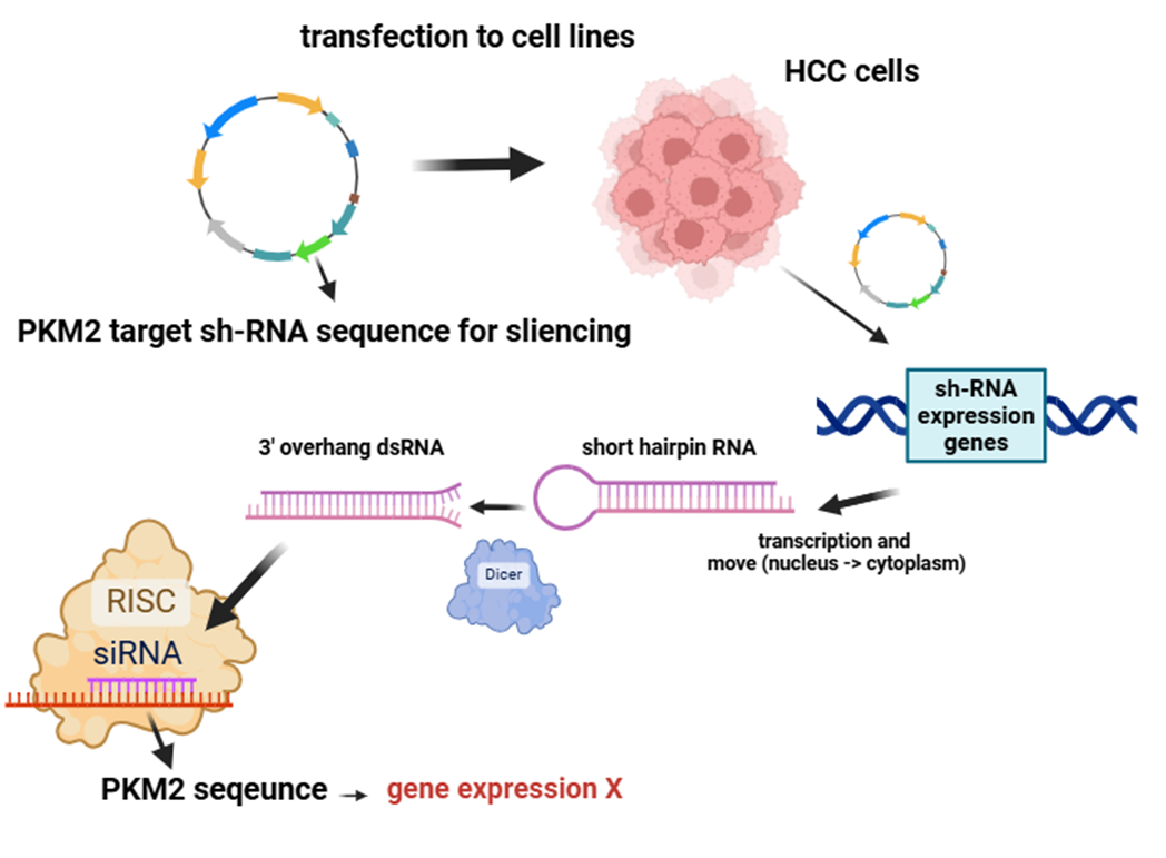 위의 이미지에서 보듯 먼저, PKM2 서열을 타깃으로 (억제하도록) 하는 short hairpin RNA를 만드는 DNA 서열을 렌티바이러스 벡터에 삽입합니다(참고로, 렌티바이러스 벡터는 분열중인 세포는 물론 비분열세포까지도 효율적으로 감염시킬 수 있는 등 유전물질 도입의 효율이 높아서 재조합 벡터로 흔히 사용된다고 합니다). 이후 이 렌티바이러스 벡터를 HCC 세포에 transfection시키면, 해당 세포의 DNA에 PKM2 타깃 shRNA 서열이 통합되고, 그럼으로써 shRNA 즉, short hair RNA들이 지속적으로 만들어지게 됩니다. 이 stem and loop 구조를 갖는 shRNA는 Dicer에 의해 가공되어 3' overhang을 갖는 double strand RNA 형태가 되고, 이후 그 중 표적 가닥 한 가닥이 siRNA로서 RISC complex를 통해 PKM2 유전자를 발현하는 mRNA 서열과 상보적으로 결합해, PKM2 유전자의 발현을 억제합니다. 보다 직접적으로 말하자면, 표적 서열인 PKM2 서열을 잘라냅니다. siRNA 말고 작년에 노벨상을 받은 miRNA는 표적 서열을 잘라내기도 하지만, siRNA와 달리 그냥 침묵을 시켜버리기도 하는데 이에 대한 내용은 길어질 듯해서 생략하겠습니다. 예전에 글로 정리한 적이 있긴 합니다.