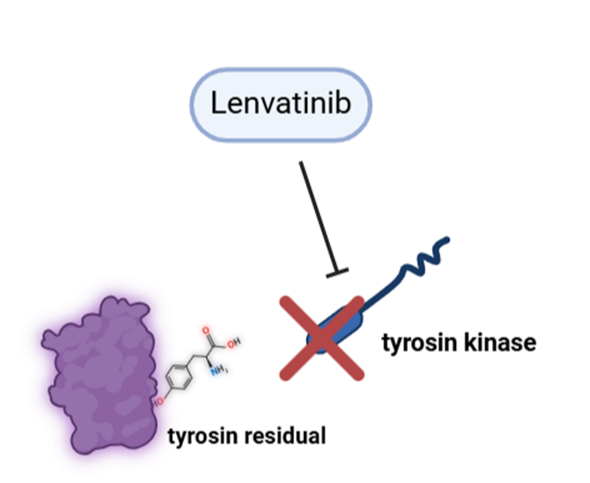 다중 키나제 억제제의 대표적인 예로는 Lenvatinib과 Sorafenib이 있는데요. Lenvatinib은 티로신 키나제를 억제하여 암세포의 성장을 저해하는 항암제로 알려져 있습니다. 여기서 티로신 키나제는 '암세포의 성장과 생존에 중요한 신호 전달 경로에 관여하는 단백질'의 티로신 잔기에 인산기를 부여해 해당 단백질을 활성화시키는 역할을 하므로, Lenvatinb은 이 티로신 키나제의 기능을 억제함으로써 암세포의 무분별한 증식을 방지하고 종양의 성장을 억제합니다. 다음으로, Sorafenib은 암세포의 증식과 혈관신생(angiogenesis)을 억제하고, 암세포의 자멸사(apoptosis)를 촉진하는 역할을 하는 다중 키나제 억제제라고 합니다.