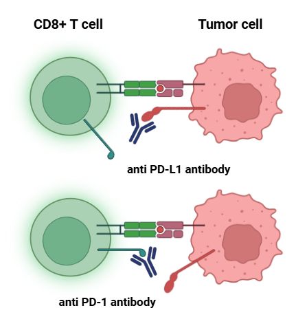 PD-1/PD-L1 blockade therapy는 종양 세포의 표면에서 발현하는 PD-L1이 T 세포의 PD-1에 결합하여 암세포가 T 세포의 면역 공격을 억제하는 기작이 이루어지지 않도록 하는 방법인데요. 구체적으로, PD-L1이 PD-1에 결합하지 못하도록 둘 중 하나 혹은 둘 모두의 수용체에 anti PD-L1 혹은 anti PD-1 항체를 결합시키는 방법입니다. 그럼으로써 T 세포가 면역 억제가 되지 않고 종양 세포를 제대로 죽이도록 유도하는 것이죠. 암세포가 면역세포의 공격을 억제시킬 수 있는 장치가 있다는 것 만으로도 놀랍긴 합니다.