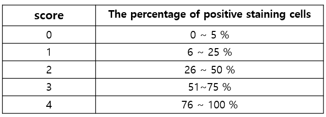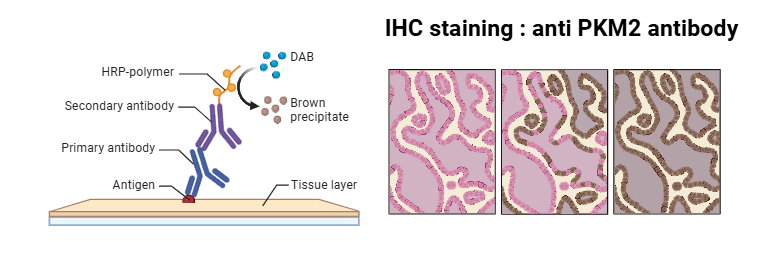 다음으로 본 연구팀은 87명의 HCC 환자에서의 PKM2의 protein level을 Tissue microarray (TMA)에 대한 IHC staining을 통해 확인했습니다. 이를 위해 PKM2에 결합하는 1차 항체와 염색에 가장 많이 쓰이는 chromogen인 Diaminobenzidine (DAB)에 반응하는 HRP가 결합된 2차 항체를 사용했다고 하는데요. PKM2가 존재하면, 항원 항체 결합을 통해 DAB 기질이 horseradish peroxidase (HRP)와 반응해 dark brown reaction product를 생산합니다. 본 연구팀은 PKM2 단백질 수준 평가를 위해 염색이 된 전체 cell 중 positive staining cell의 비율을 기준으로 점수를 매겼습니다.