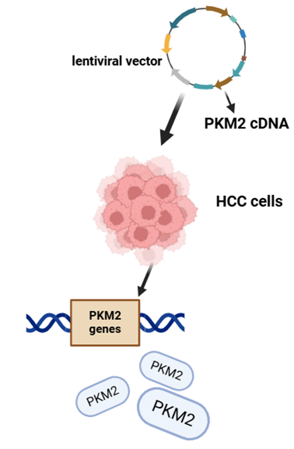 PKM2의 overexpression을 위한 전략은 보다 쉽습니다. PKM2의 cDNA를 또 다른 렌티바이러스 벡터에 삽입한 뒤, 이 벡터의 PKM2 서열을 HCC 세포의 DNA에 통합시킵니다. 그로인해 PKM2 유전자가 많아지니 보다 많은 PKM2 단백질을 만들게 되는 것이죠.