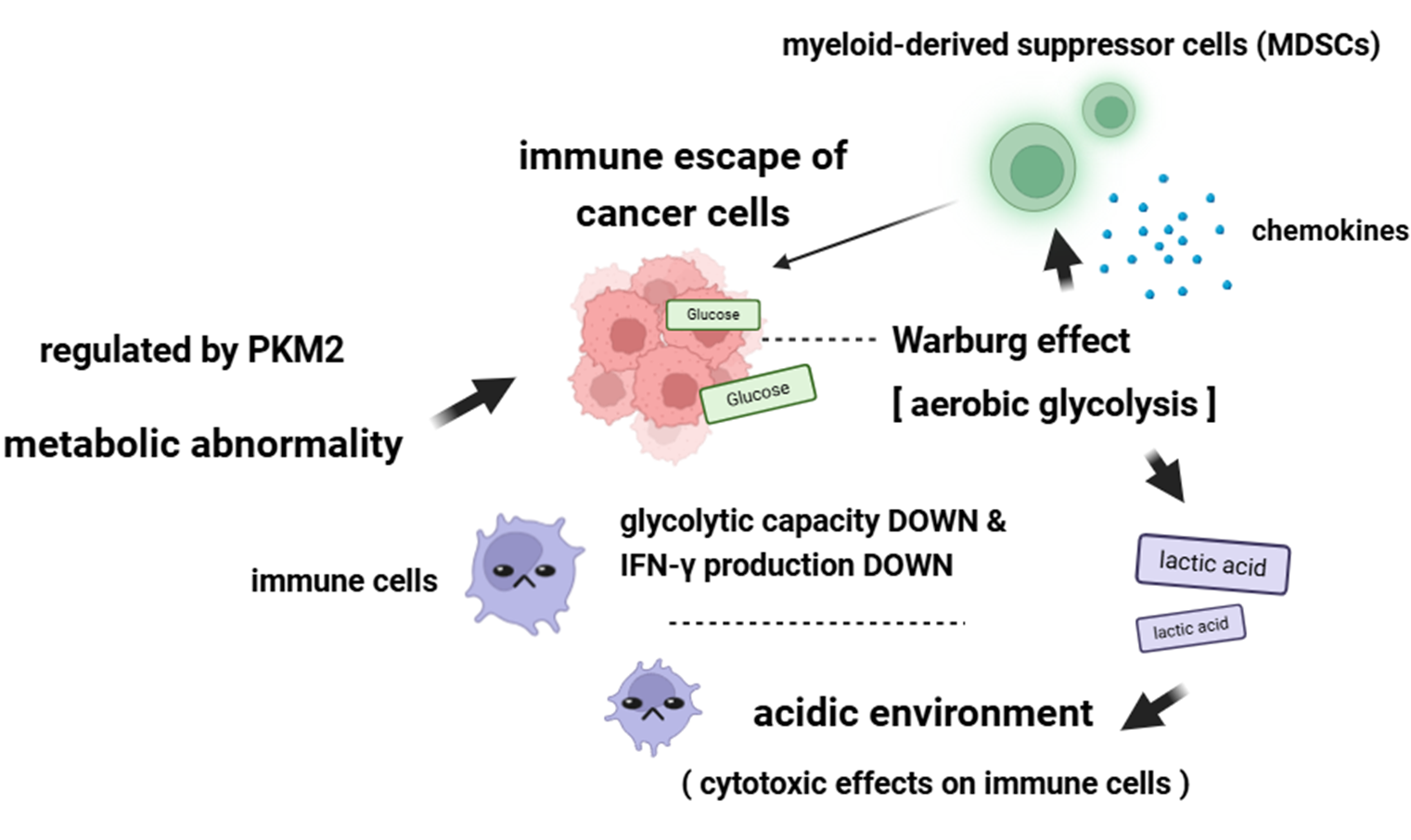 반면, PKM2는 저촉매 활성을 보여 해당과정을 통한 피루브산 생성 속도를 늦추죠. 결과적으로 PKM1 대신 PKM2가 작용하면 해당과정은 지속되지만, 생성된 피루브산이 미토콘드리아로 충분히 이동하지 못하고 세포질에 축적됩니다. 피루브산이 빠르게 생성되지 못하면, 세포질 내 피루브산 농도가 낮아서, 미토콘드리아 내로 피루브산을 이동하는 '미토콘드리아 피루브산 수송체(MPC)' 작동을 위한 농도 구배(gradient)를 형성하기 어려울 수 있기 때문입니다. 버스에 일정 인원 이상이 타야 수요에 맞춰 버스가 운행될 수 있는 것에 비유할 수 있겠습니다. 사람이 너무 없으면 기름값에서부터 적자가 날테니까요. 이는 에너지 낭비죠. 그런데 산화적 인산화로 많은 양의 ATP를 만들어내려면 미토콘드리아로 이동해야 하는데.. 결국 PKM2는 해당 세포의 대사 과정을 해당 과정에 의존하도록 하고, 하나의 포도당으로부터 적은 양의 ATP 밖에 만들어내지 못하게 합니다. 또한, 미토콘드리아로 이동하지 못하고 세포질 내 축적된 피루브산은 결국 젖산탈수소효소(LDH)에 의해 빠르게 젖산으로 전환되며, 젖산이 축적되면 해당 환경은 산성화됩니다.