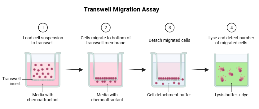 참고로, Migration 및 Invasion assay는 아주 작은 기공을 가진 폴리카보네이트 막으로 상·하부가 분리된 Transwell 챔버를 사용하는데요. 상부 챔버에 세포를 주입한 뒤 일정 시간 후 막을 통과한 세포를 염색하여 Migration 및 Invasion 능력을 정량적으로 평가합니다. 이때, Migration 정도를 확인하는 케이스에선 상부 챔버에 Martigel 없이 진행해 순수 이동 능력을 측정하고, Invasion 정도를 확인하는 케이스에선 막을 Matrigel 등으로 코팅하여 ECM 침윤(전이) 능력을 확인한다고 하네요. 즉, 본 방법은 상부 챔버에 세포를 주입하고 일정 시간 배양한 뒤, 막을 통과한 세포를 염색하여 현미경으로 Migation과 Invasion 정도를 정량적으로 관찰 및 계산하는 방식으로 진행됩니다.