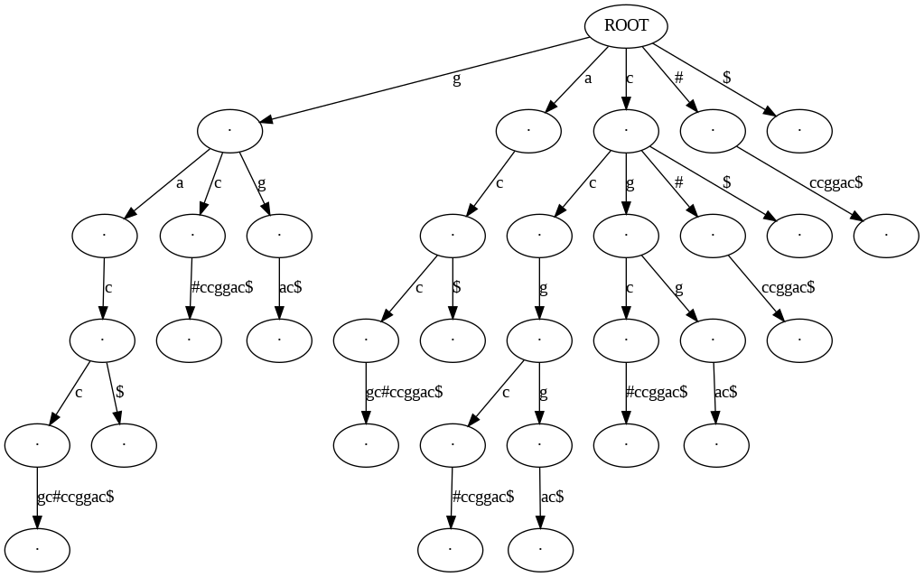 두 리드의 중첩된 영역 식별 즉, 한 리드의 접미사와 다른 리드의 접두사 간의 일치를 식별은 서픽스트리에 '구분 문자'를 나타냄으로써 가능하게 만들 수 있습니다. 예로, 간단하게 'gaccgc'와 'ccggac'라는 2개의 리드가 있다고 가정해봅시다. 여기서 첫번째 문자열엔 구분문자 '#'를 추가하고 두번째 문자열에 구분문자 '$'를 추가하면 결합된 문자열은 'gaccgc#ccggac$'이 됩니다. 이를 서픽스트리로 나타내면 다음과 같습니다(챗GPT가 알려준 파이썬 코드로 구현해서 얻은 이미지입니다).