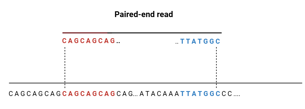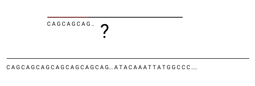 참고로, 여기서 'CAGCAGCAG.. '로 되어있는 DNA 조각은 서열이 한번 읽혔다고 해서 '리드(read)'라고 합니다. 그리고 이와 같이 '조각의 한쪽 끝에서만 서열이 보고되는 기술 1)'을 'Single-end read'라고 합니다. 그렇다면 왜 조각 전체 서열을 보고하지 조각의 한쪽 끝에서만 서열을 보고하는걸까요? 이 또한 앞서 말했듯 기술적 한계라고 볼 수 있겠습니다. 그말은 즉슨, 기술의 발전이 과학의 발전으로 이어질 수 있다는 말이기도 하겠죠. 생물정보학의 발전은 이러한 흐름으로 이어지고 있는 듯합니다. 다시 질문으로 돌아와서 CAGCAGCAG 서열(..도 CAG 반복으로 총 50 bp 정도라고 가정, 참조 서열의 CAG 반복은 30이라고 가정(30x3 = 90))은 어디에 끼워넣을 수 있을까요? 이미지에서 오른쪽에서부터 첫번째 C에서 시작해도 될 것 같고, 네번째 C에서 시작해도 문제가 없을 듯 합니다(참고로, 헌팅턴 증후군의 경우 CAG 서열이 약 30개 정도 반복되는 특징이 나타납니다. 그래서 예시로 한번 대충 만들어봤습니다).